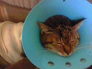今では腹帯を外してエリザベスカラーだけを着けています。