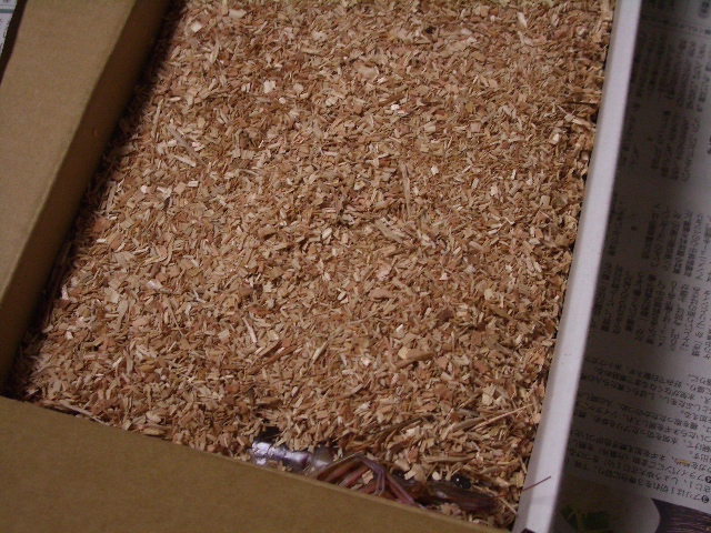 おが屑に埋もれて、生きた車海老が入っています。