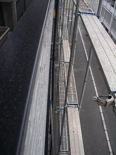 15時頃、買い物に出掛けようと外に出ると、4人の職人さんが通路側の壁の補修をしていました。